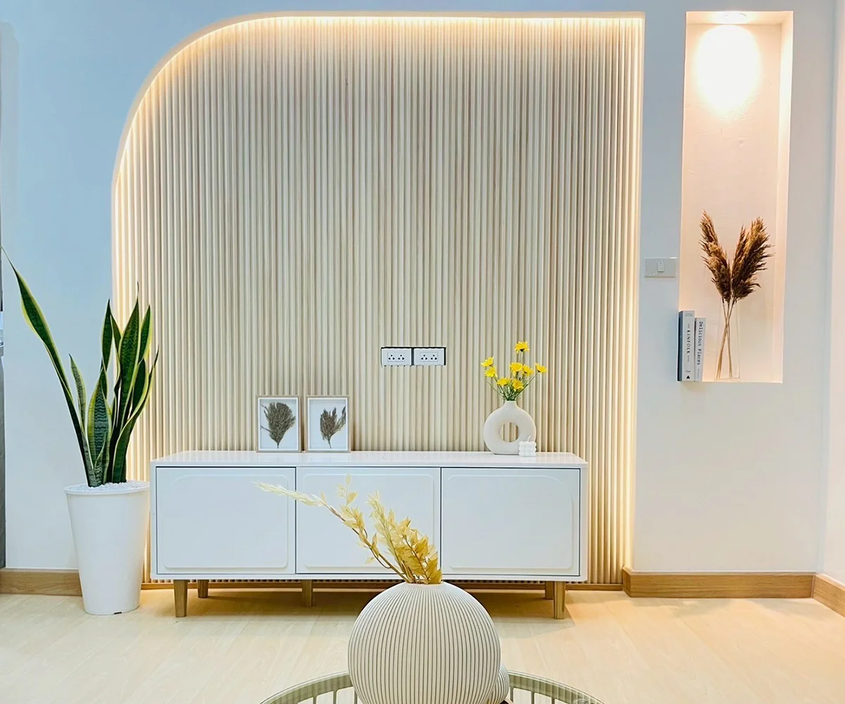 Eco Wallboard รุ่นลอนโค้ง มักถูกใช้ในจุดที่ต้องการสร้างอารมณ์เฉพาะให้กับห้อง เช่น ผนังหลังทีวี ผนังหัวเตียง ผนังโถงทางเข้า หรือผนังในห้องทำงาน ลอนโค้งช่วยนำสายตา ทำให้ผนังดูยาวหรือสูงขึ้น และช่วยเชื่อมพื้นที่ให้ดูต่อเนื่อง |